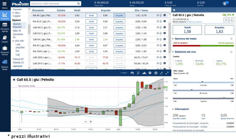 Le opzioni CFD (Out e Call) prevedono una leva massima di 1:5, quindi puoi cominciare con 100 euro per ottenere l’effetto di 500 euro di capitale.