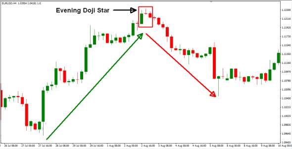 Per capire quanto possano essere utili le principali figure di candele giapponesi, vediamo un esempio concreto qui sotto, dove ti mostriamo uno dei pattern più noti, che si chiama “evening doji star“.