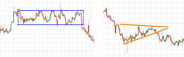Quello che vedi nei due screenshot tratti dal broker sono due famosi PATTERN CANDLESTICK. Più precisamente sono un pattern “rettangolo” (a sinistra) e un pattern “triangolo” (a destra).