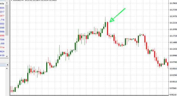 All’apice di un trend la presenza di un’ampia escursione di prezzo (testimoniata da un corpo ampio della candela) dimostra che venditori e compratori si stanno dando grande battaglia per conquistare il mercato.