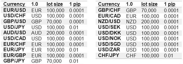 Per il momento ti mostriamo una immagine che riporta la dimensione (teorica!) di ogni lotto per le coppie di valute più scambiate del Forex, nonché il valore di un pip per ognuna di esse.