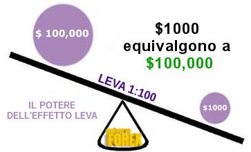Il meccanismo è semplice: se il broker permette una leva 1/100, significa che ci basteranno 1.000 dollari anziché 100mila per aprire un contratto. Se il broker permette una leva 1/50, ci basteranno invece 2.000 dollari.