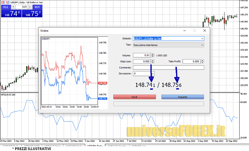 Nell’esempio sulla piattaforma di investimento , se la coppia USD-JPY è a quota 148,74… QUATTRO è il pip.