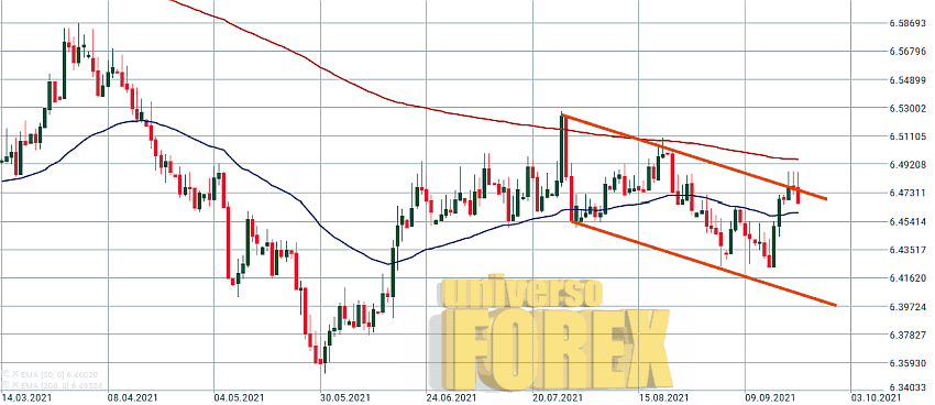 Il cambio USDCNH nel giro di una settimana è passato dal minimo di 3 mesi a 6,41 al massimi di un mese di 6,48, dopo aver tagliato la EMA50 (fonte grafica broker ).