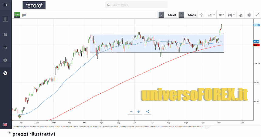 L’IJR è appena venuto fuori da un lunghissimo canale delimitato tra 105,70 e 115,43, dentro al quale ha oscillato da marzo scorso, come vediamo sulla piattaforma del broker .