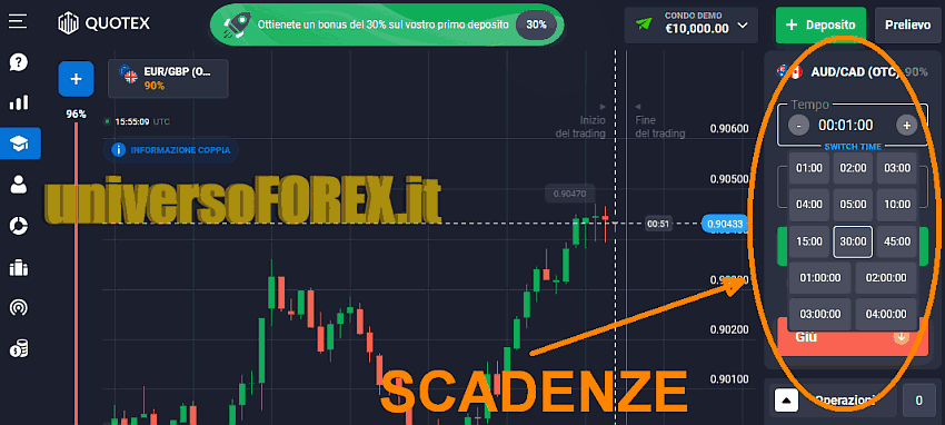 Le scadenze sono anche regolabili a passi di un secondo. Ad esempio puoi scegliere la scadenza di 1 minuto e 17 secondi. Le scadenze decorrono dal momento del click, quindi non corrispondono alle candele.