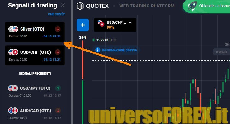 Per questo motivo ogni segnale non solo indica l’asset cui si riferisce e la direzione (rialzo/ribasso), ma anche la durata consigliata del trade e l’orario in cui il segnale è stato emesso.