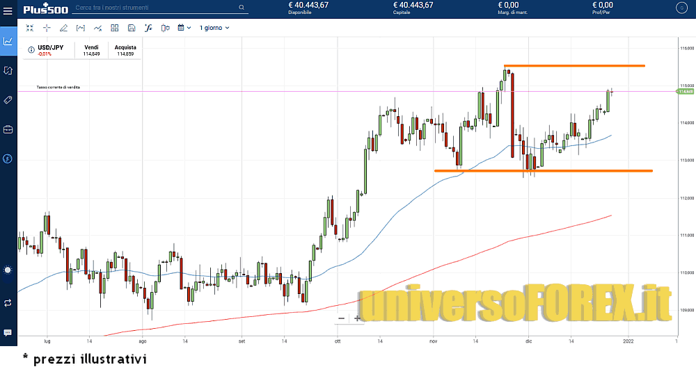 Il cambio USDJPY si muove attorno 114,7 ma si sta riavvicinando ai massimi di 3 anni toccati a fine novembre, come possiamo vedere sul broker .