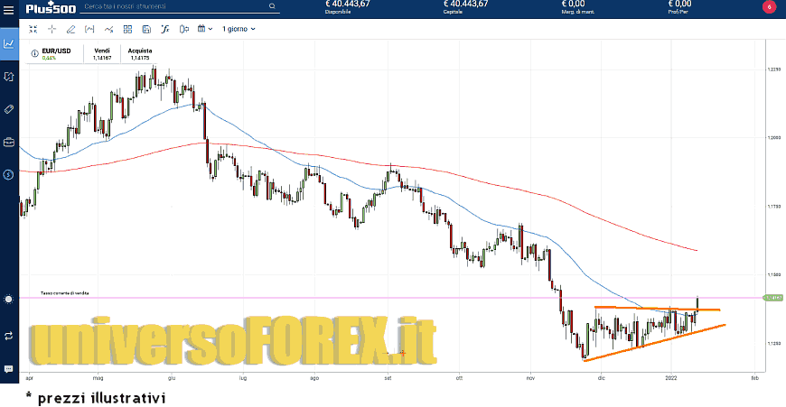 Il cambio EURUSD sale così oltre 1,14, al livello più forte in 8 settimane e si lascia alle spalle la EMA50, come vediamo sul broker .