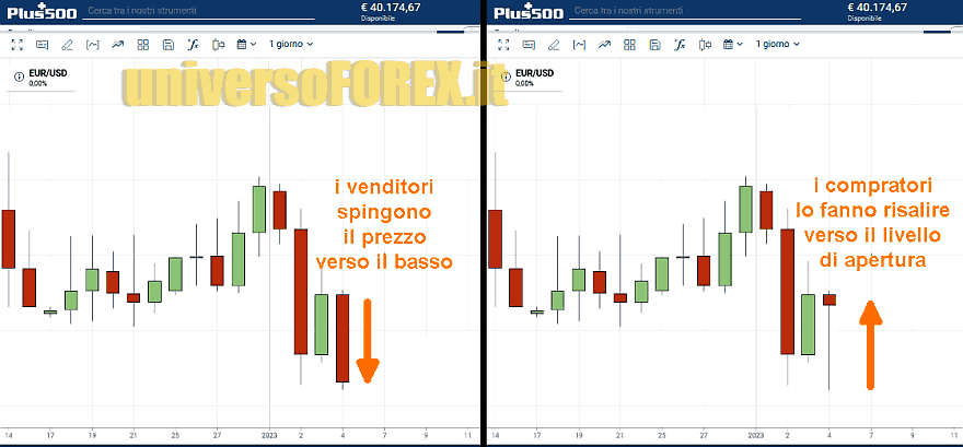 Tuttavia (come vediamo nel quadrante di destra) i compratori riemergono spingendo il prezzo verso il livello che aveva in apertura. Ciò significa che i venditori non hanno più la forza di spingere il trend, al punto che i compratori riescono a controbattere con una certa forza.