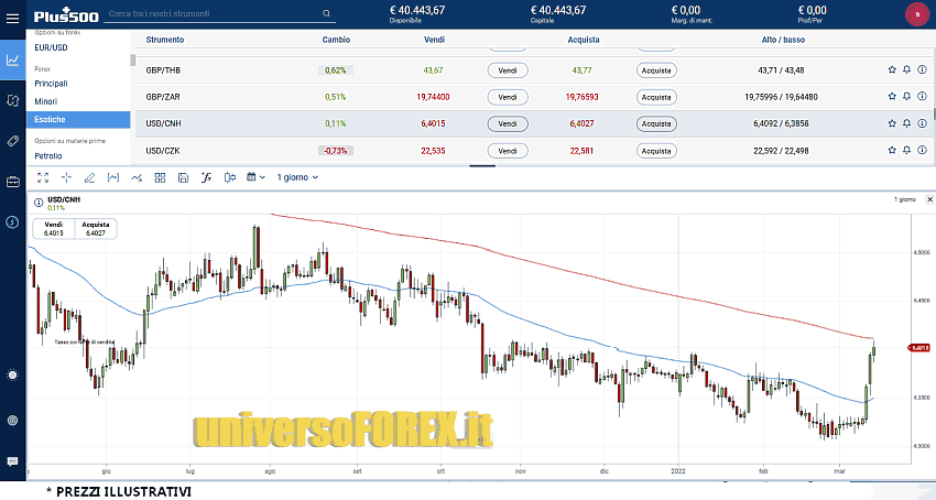 La valuta cinese perde così quota. Il cambio USDCNH è salito a oltre 6,40 per dollaro, toccando il massimo da novembre e ritirandosi ulteriormente dal minimo di 4 anni toccato sul finire di febbraio a 6,30, come possiamo vedere sul famoso broker .