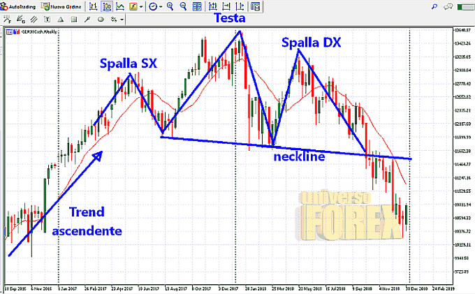 Come si può notare, il “testa e spalle” ha una forte somiglianza con il triplo massimo/minimo. Anche in questo caso infatti si generano tre “picchi” oppure tre “valli”, con la differenza che in questo caso il picco/valle centrale è più pronunciato degli altri due che sono ai suoi lati.