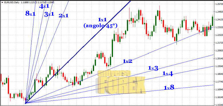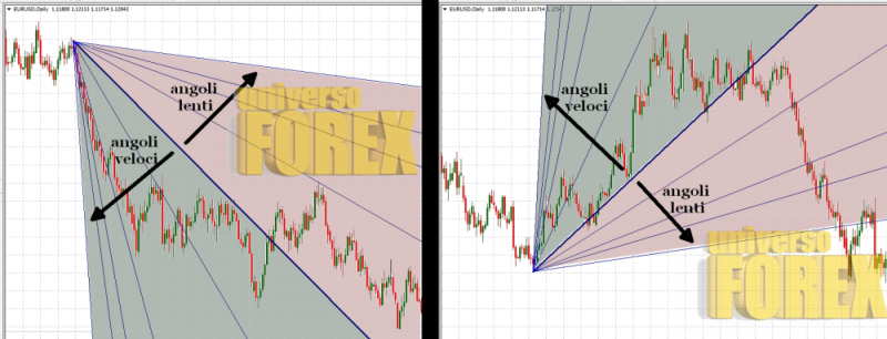 Le linee del ventaglio di Gann seguono una angolazione ben precisa.