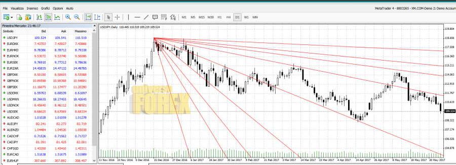 Del resto non è un caso se tutte le migliori piattaforme di trading hanno un indicatore specifico che potresti trovare con il nome “linee di Gann“, “ventaglio di Gann” oppure “Gann fan“.