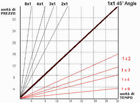 A) ANGOLO NATURALE, quello di 45 gradi (l’angolo “1×1”). E’ il più importante e viene anche detto “linea della vita”. Esso è l’angolo al quale l’incremento di 1 unità di tempo corrisponde alla variazione (incremento/decremento) di “1 unità di prezzo”.