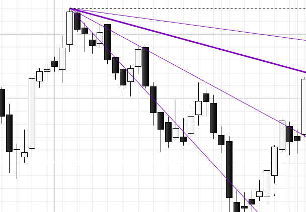 Come puoi vedere, il mercato si è mosso per tre sessioni consecutive contro il trend rialzista, formando massimi e minimi decrescenti. Questo fa sì che il nostro punto di massimo sia stato “confermato”, e quindi possiamo tracciare il ventaglio dal massimo della sua candela.