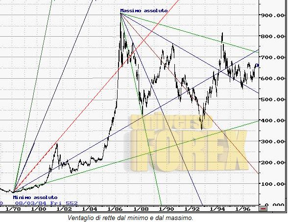 Gann non si limitava a tracciare il suo ventaglio da un singolo minimo o un singolo massimo, ma tracciava diversi ventagli con origine da più punti. Questo perché secondo il suo punto di vista, l’efficacia di un ventaglio poteva durare anche tantissimo tempo, durante il quale magari se ne creavano anche altri, senza per questo minare la validità del primo.