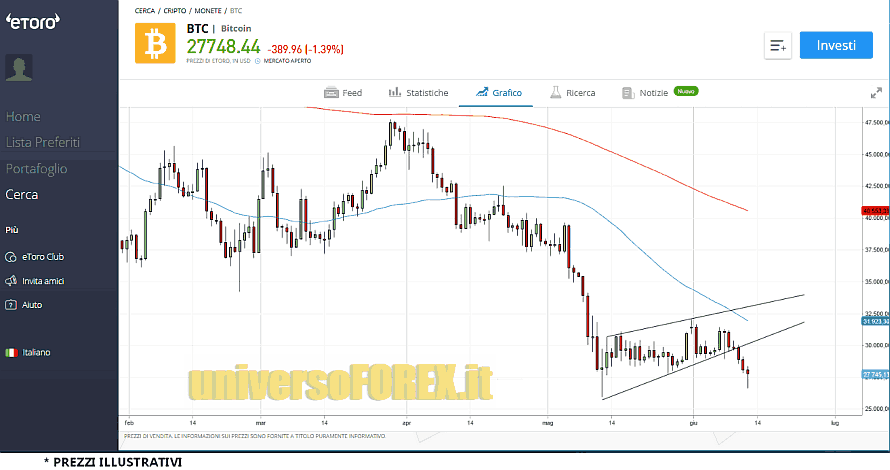 Come vediamo chiaramente sul broker , il prezzo ha fatto breakout dal cuneo e questo apre scenari pesanti, visto che il target di potrebbe essere fissato anche sotto i 25mila dollari.
