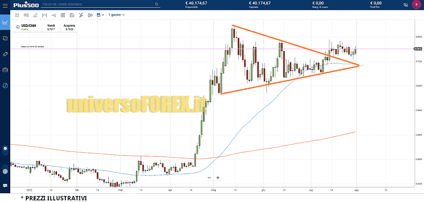 Di recente il cambio USDCNH ha infranto il triangolo, facendo immaginare un forte impulso rialzista, che tuttavia non c’è ancora stato.
