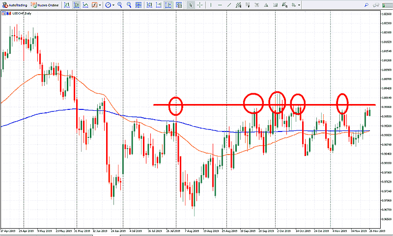 La coppia UsdChf ha guadagnato circa un punto percentuale negli ultimi giorni, inerpicandosi fino a quota 0,997, a un passo dalla parità. Come possiamo vedere sulla piattaforma . Il cambio ha nuovamente varcato le medie mobili a 50 e 200 periodi e sta testando il livello 0,9986 che già nel recente passato ha rappresentato un livello di resistenza importante (e zone di potenziale prese di profitto degli acquirenti).