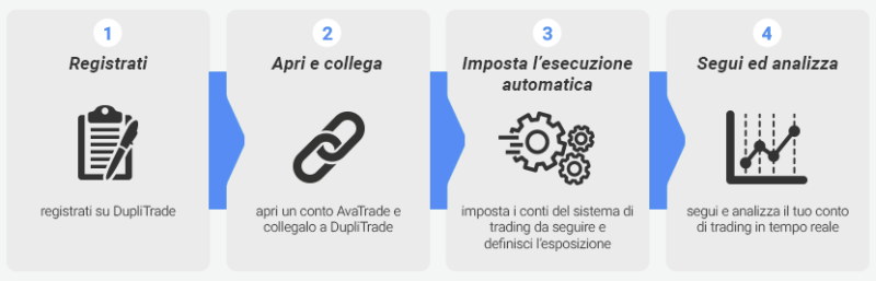 1) . DupliTrade è una piattaforma ad hoc, trasparente e facile da utilizzare che ti consente di replicare automaticamente le azioni di trader esperti direttamente sul tuo conto di trading di AvaTrade.