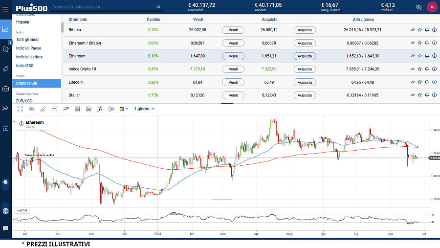 Anche su Plus500 è possibile negoziare CFD su come Bitcoin, Ethereum e tante altre, speculando sui loro movimenti di prezzo, senza possederle di fatto.