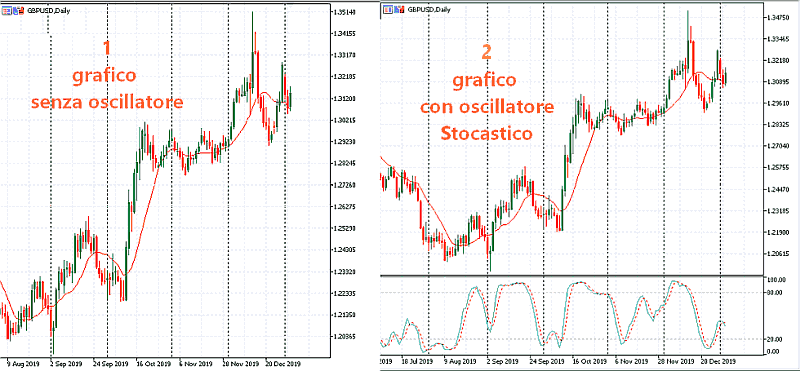 Nella figura 2 invece abbiamo inserito un oscillatore (precisamente si tratta dello stocastico) nella parte inferiore del grafico.