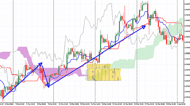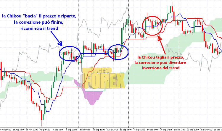 Come vediamo nell’immagine qui sotto, quando nei corso di un trend si assiste a un movimento correttivo, il tocco della Chikou sui prezzi attuali può segnalare la fine della correzione e la ripresa del trend. Se invece la Chikou rompe la linea del prezzo, allora la correzione potrebbe diventare inversione.