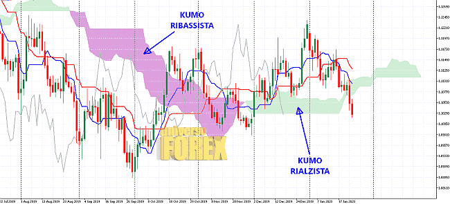 …come vedi, sulla piattaforma di investimento l’Ichimoku disegna delle aree colorate, che si chiamano “nuvole” (ICHIMOKU CLOUD oppure “KUMO”).