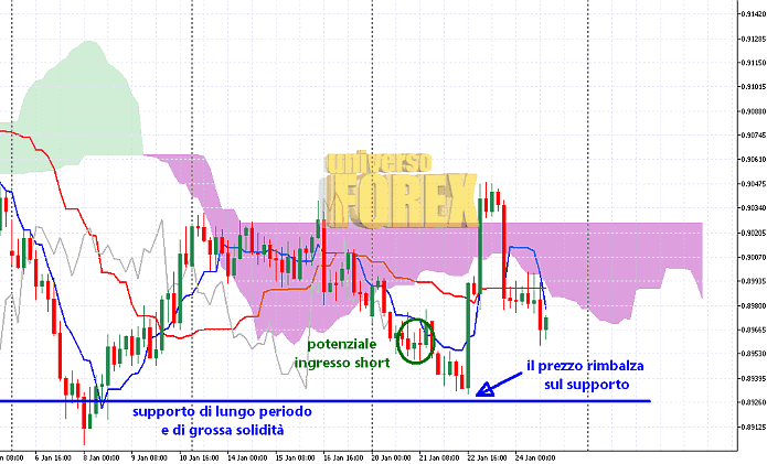 Il TERZO chiarimento è che bisogna sempre disegnare sempre supporti e resistenze (come abbiamo visto la Chikou è UTILISSIMA anche per questo scopo), perché in prossimità di esse la cosa migliore da fare – anche se siamo in presenza di un bel segnale Ichimoku forte – potrebbe essere aspettare la rottura o il rimbalzo su di esse, per attendere una conferma di ingresso oppure per astenerci.