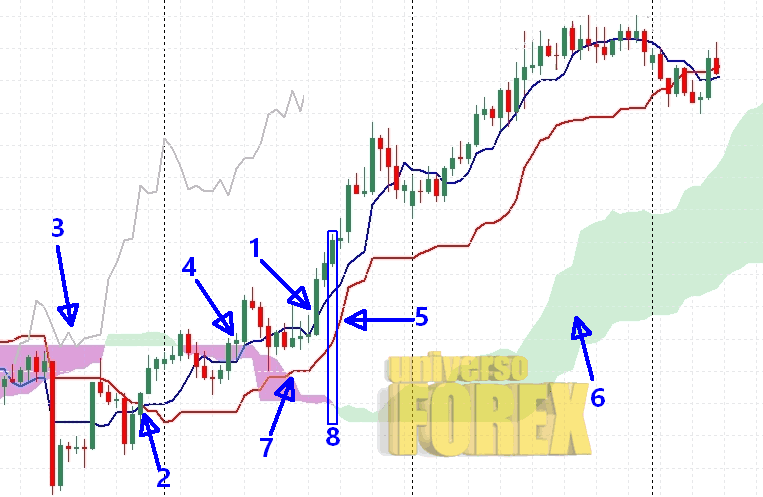 8) si crea un allineamento per cui il prezzo è sopra la media più veloce (Tenkan Sen) che a sua volta è sopra la media più lenta (Kijun Sen) a tutti sono sopra la KUMO.