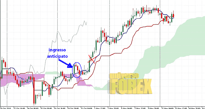 Se riprendiamo l’esempio rialzista visto poco fa su , possiamo vedere gli effetti di un ingresso anticipato (quello col cerchio invece che con la croce) quando ancora non si erano verificate le ultime due condizioni.