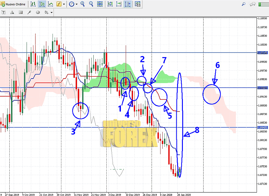 Come si può vedere quindi, la strategia Ichimoku prevede che si si osservino con attenzione molteplici aspetti del grafico, cogliendone il senso.