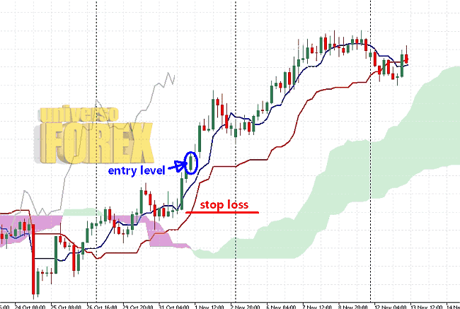 Lo Stop loss quindi potremmo metterlo subito sotto la Kijun (in caso di ingresso rialzista), o subito sopra di essa (in caso di ingresso al ribasso), o alternativamente fissare lo Stop loss all’interno della Kumo.