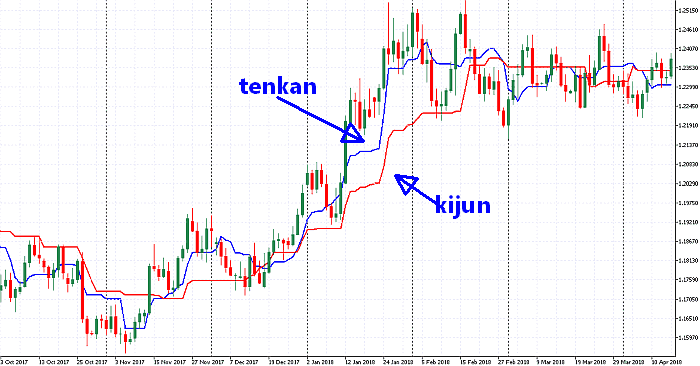 Sono due medie mobili che vengono calcolate sulla differenza tra il prezzo più alto e il prezzo più basso, rispettivamente sugli ultimi 9 periodi (la Tenkan-sen) e sugli ultimi 26 periodi (la Kijun-sen).