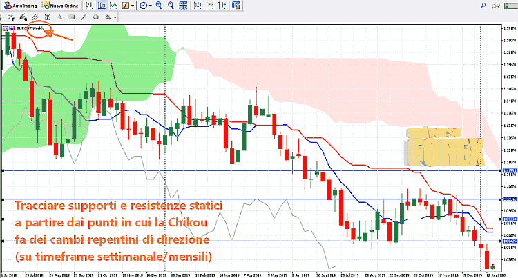 IMPORTANTE: La Chikou è UTILISSIMA anche per tracciare supporti e resistenze statici (specialmente su timeframe ampi, ad esempio settimanale o mensile).