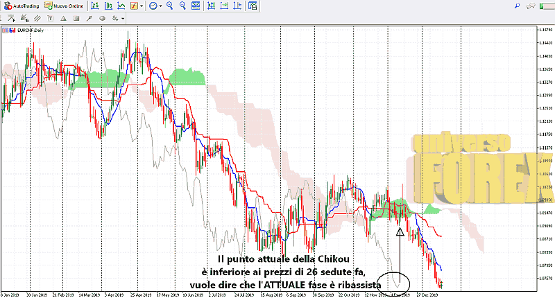 a) Se il punto attuale della Chikou è sotto i prezzi di 26 sedute fa, l’ATTUALE fase è ribassista (vedi l’immagine qui sotto).