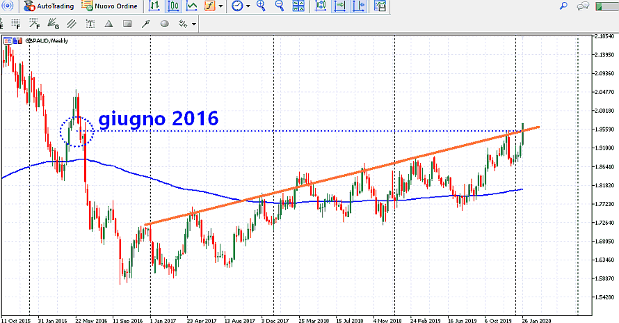 Il cambio GBPAUD ha infatti toccato il livello di 1.954 (cosa che non accadeva da giugno 2016) e sta testando la trendline di lungo periodo, che sa violata potrebbe dare luogo a ulteriori slanci rialzisti.