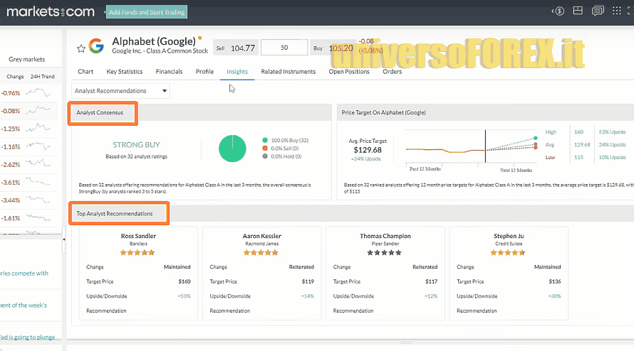 Come vediamo c’è una sezione apposita che si chiama ANALISI DI MERCATO, dove si trovano ANALISI TECNICHE con i principali LIVELLI DI PREZZO da monitorare, ma anche dei veri e propri SEGNALI DI TRADING e le raccomandazioni delle principali banche d’affari come Morgan Stanley, Barclays, Deutsche Bank e altre. .