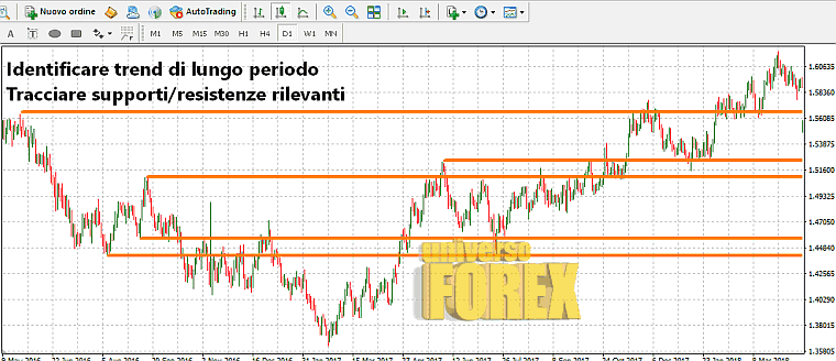 Per questo motivo si deve ampliare il proprio orizzonte e guardare anzitutto il lungo periodo, perché sono i timeframe più lunghi il nostro punto di riferimento principale, ovvero quelli dove vanno definiti i livelli di supporto e resistenza più importanti.