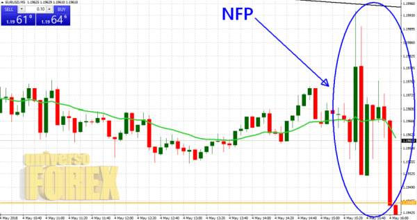 Qui sotto vediamo sulla piattaforma un esempio di cosa succede quando viene rilasciato il dato sul lavoro USA (Non Farm Payroll): il prezzo improvvisamente si muove tantissimo.