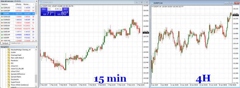 Per fare un esempio concreto, se operiamo su timeframe 15 minuti, sarà bene anche guardare un timeframe più ampio come le 4 ore (4H) per studiare la presenza di eventuali trend secondari, come accade nell’immagine qui sotto sull apiattaforma .