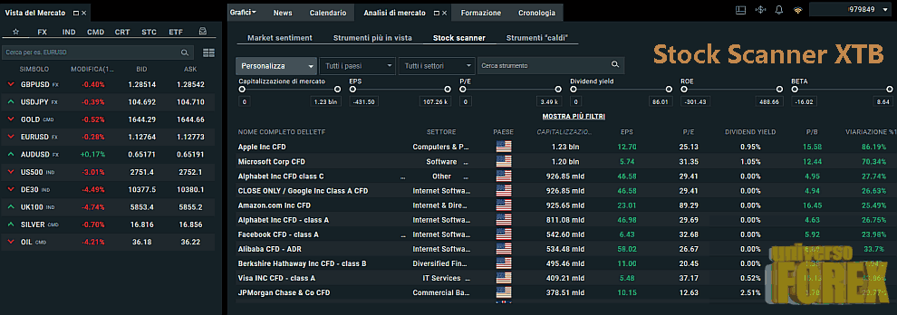 C’è anche una esclusiva sezione “stock scanner”, che compara e filtra le azioni in base ai dati fondamentali (ROE, dividend yeld, Beta, EPS, P/E).
