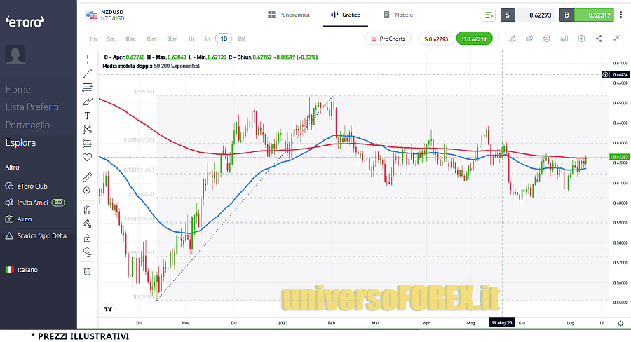 Questa mossa non ha impresso grandi cambiamenti al cambio , che rimane su 0,62 in prossimità dei massimi di 3 settimane e continua a oscillare tra la EMA50 e la EMA200.