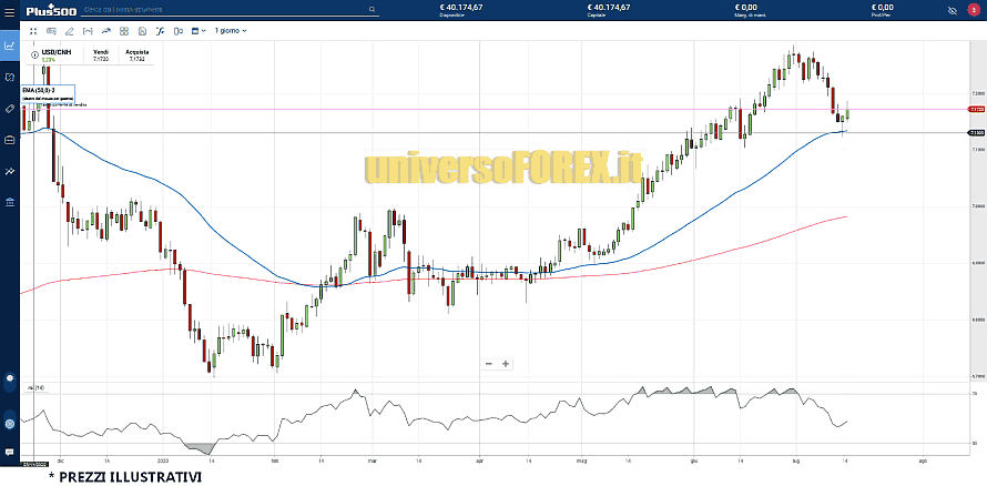 Se l’ riuscirà a superare il test della EMA50, allora la discesa non troverebbe altri grandi ostacoli fino alla soglia psicologica di 7,00 che venne infranta a maggio.