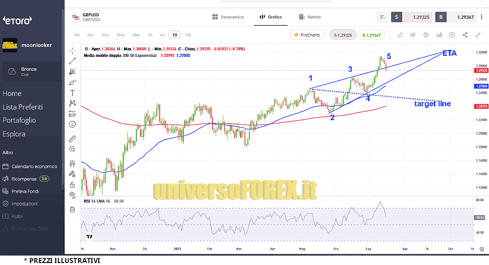 Settimana scorsa dicemmo che si stava formando un Wolfe Wave pattern di inversione. Ebbene, con il superamento della trendline che unisce i punti 1-3 (il “falso breakout”) la figura si è completata.