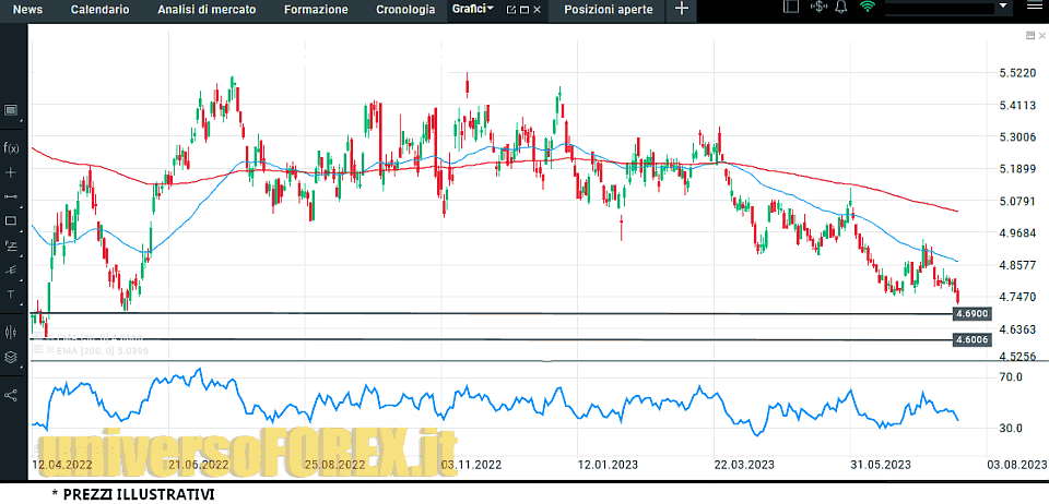 Se la tendenza dovesse proseguire, il cambio USDBRL ha come obiettivo il supporto statico a 4,69 e più giù ancora la soglia 4,60 (minimo di aprile 2022).