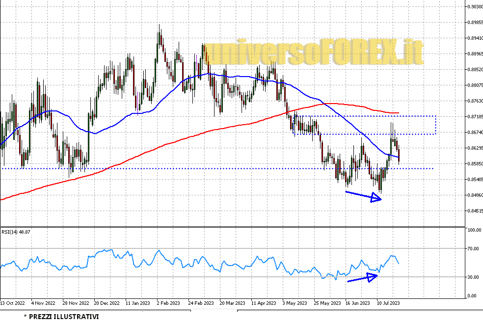 Come vediamo sul grafico, negli ultimi giorni il cambio EURGBP ha bruscamente frenato dopo lo slancio rialzista che era stato innescato a inizio luglio dalla chiara divergenza prezzi-RSI.