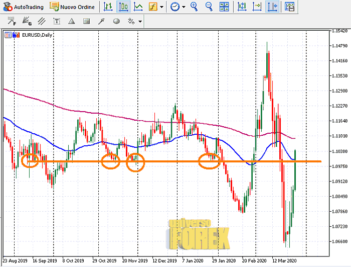Il cambio EURUSD si muove al rialzo per il quarto giorno consecutivo, ed è tornato oltre 1,10 soglia psicologica che negli ultimi mesi aveva funto spesso da supporto (fonte grafica broker ).