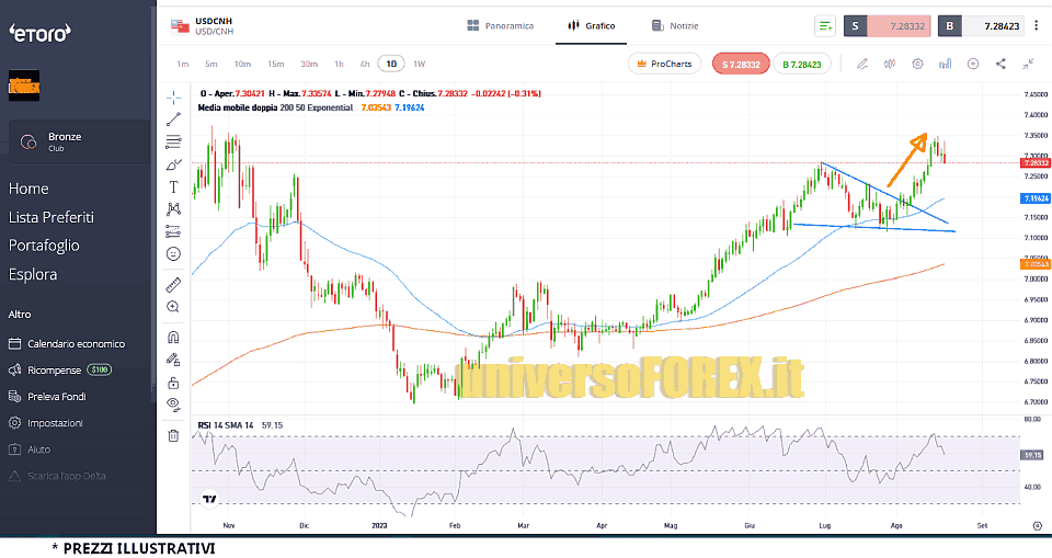 L’impulso rialzista successivo al breakout del pattern triangolo è stato molto robusto (del resto ve l’avevamo preannunciato settimane fa). Nonostante la recente pausa, il quadro rimane fortemente rialzista. Tuttavia la comparsa di una long legged doji deve indurre ad una certa prudenza, perché manifesta l’incertezza del mercato riguardo a cosa succederà.